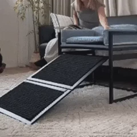 - Space-Saving Foldable Design: Need more room? Simply fold the ramp under the frame. The sleek, modern frame with metal-look construction offers durability without taking up bulky floor space.